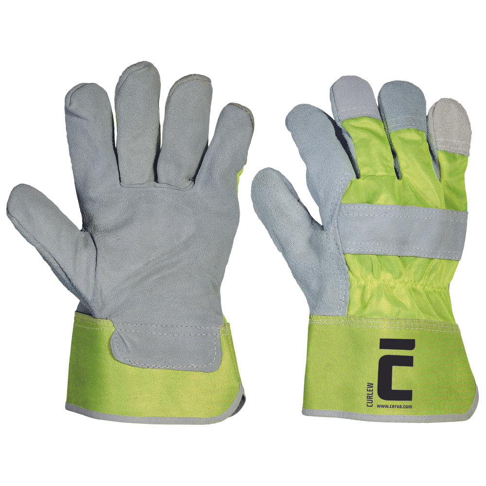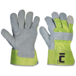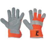 Rękawice wzmacniane jednokolorową dwoiną wołową w części chwytnej dłoni, grzbiet dłoni oraz mankiet wykonane z dzianiny poliestrowej w kolorze odblaskowym.
