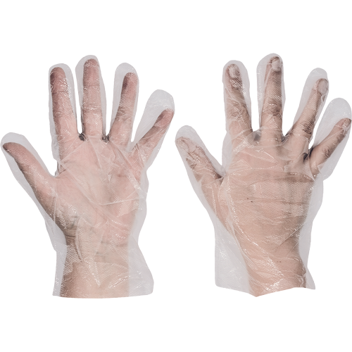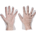 Rękawice jednorazowe z folii polietylenowej, nadające się do krótkotrwałego kontaktu z produktami spożywczymi.
