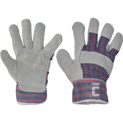 Rękawice ochronne szyte z wysokiej jakości koziej skóry w części chwytnej i bawełnianej dzianiny w części wierzchniej. Opuszki palców pokryte skórą. Mankiety zapinane na rzepy Velcro.