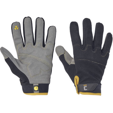 Rękawice dziane, szyte, część dłonicowa ze sztucznego zamszu z podszewką, część wierzchnia z włókna syntetycznego zawierającego Spandex oraz ochronniki stawów. Mankiet zapinany na rzep.