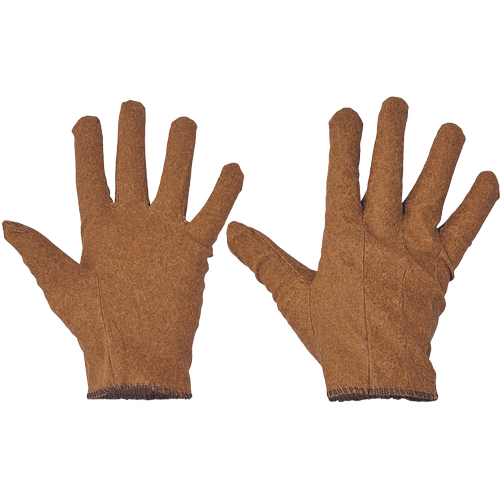 Beżowe rękawice szyte z bawełnianej dzianiny, pokryte warstwą winylu.