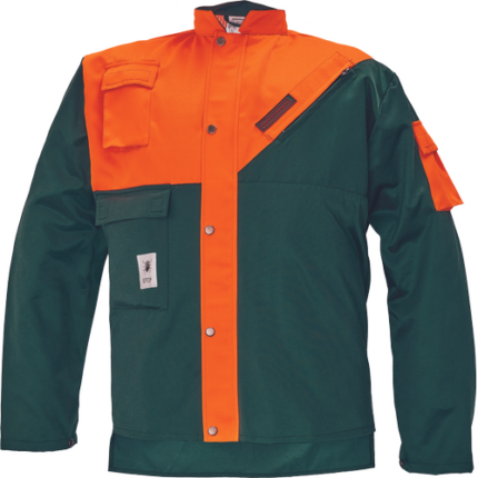 męska kurtka robocza ze stójką • powłoka wodo- oraz olejoodporna • zapięcie na zamek błyskawiczny oraz metalowe zatrzaski • wzmocnienia na rękawach, mankiety z zatrzaskami • 2 kieszenie piersiowe przykryte patkami zapinanymi na metalowe zatrzaski • pas regulujący z tyłu • elementy odblaskowe – taśmy szerokości 2,5 cm