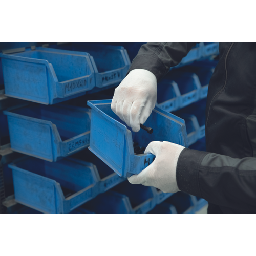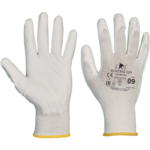 Bezszwowe, dziane rękawice poliestrowe w części dłonicowej i na palcach powlekane poliuretanem. Elastyczne mankiety.