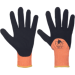 Szyte rękawice Hi-Vis wykonane z mieszanki poliestru i Spandexu wzmacniane syntetyczną skórą w części chwytnej i na koniuszkach palców. W części chwytnej dłoni silkonowy zadruk dla zwiększonej chwytności, neoprenowy mankiet zapinany na rzepy Velcro. Wstawka frotte chłonąca pot na wierzchniej części kciuka.