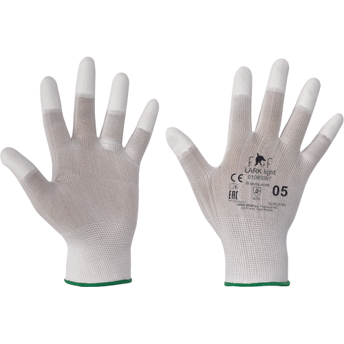 Dziane, bezszwowe rękawice wykonane z poliestru. Cienka warstwa powleczenia poliuretanem na czubkach palców. Elastyczny mankiet.