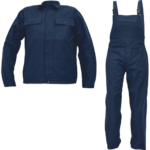 • bluza i ogrodniczki robocze prostego wzoru • bluza zapinana na guziki, posiada 2 kieszenie • ogrodniczki posiadają 4 kieszenie i boczną kieszonkę na miarkę