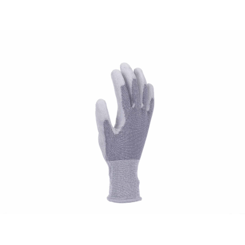 Dziane, bezszwowe rękawice. Odporność na przecięcie B. Powlekane szarym PU w części dłonicowej i na palcach. Elastyczny mankiet.