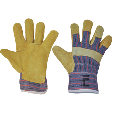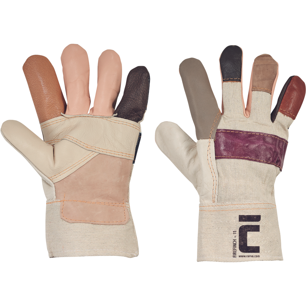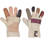 Rękawice wzmacniane wielokolorową skórą meblową licową, z ocieplaną podszewką, grzbiet dłoni oraz mankiet wykonane z tkaniny bawełnianej.