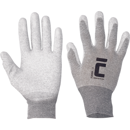Dziane, bezszwowe rękawice nylonowe z włóknem węglowym; powlekane warstwą poliuretanu na palcach; elastyczny mankiet.