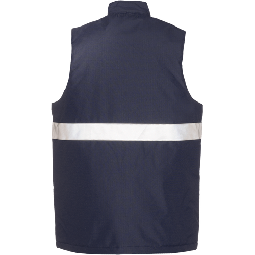 • warm, comfortable and breathable multi-norm vest with reflective FR stripe on the chest • straight collar • zip fastening • 2 sewn-in flap pockets with velcro closure • hem with elastic cord • non-flammable reflective stripes (50 mm) • solid flame retardant quilted cotton lining • 1 inner pocket