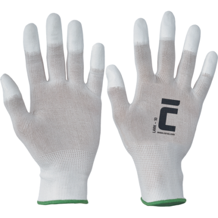 Dziane, bezszwowe, nylonowe rękawice (15GG), pokryte elastyczną gumą w części chwytnej dłoni i na palcach, elastyczny ściągacz.