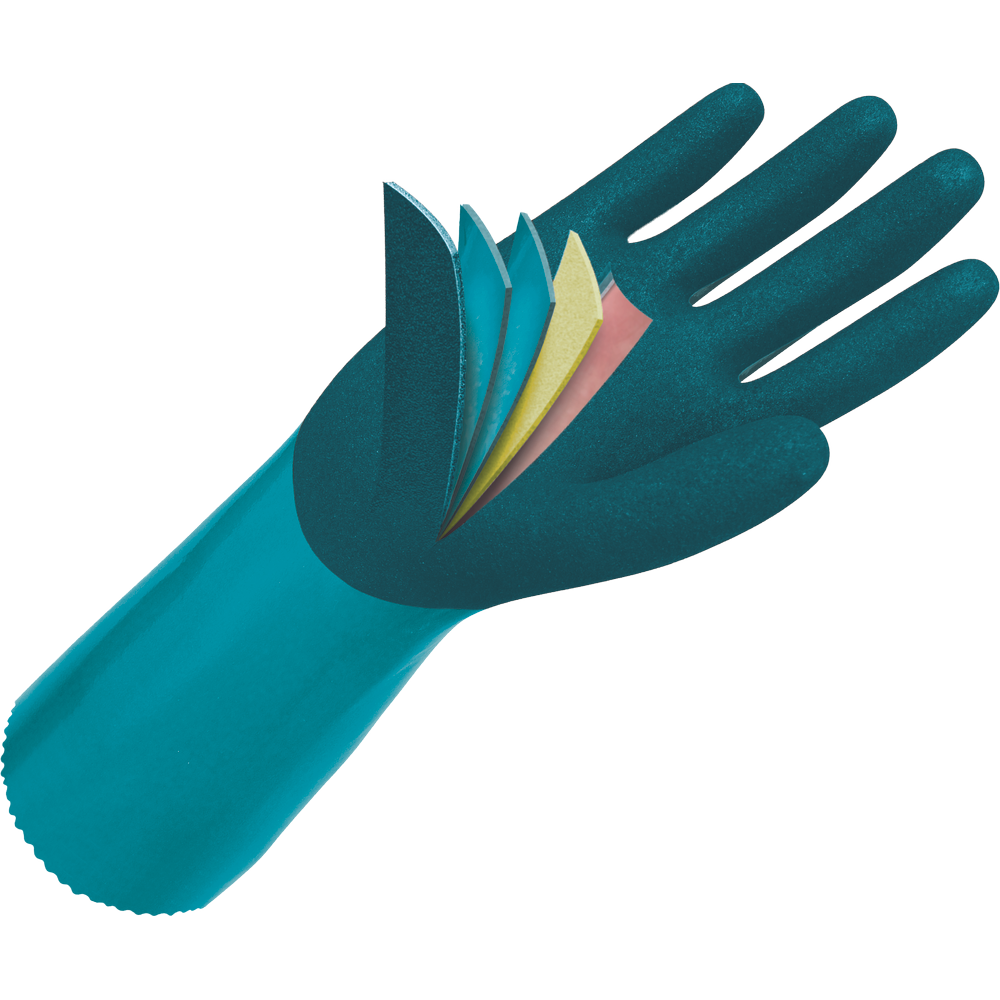 Szyte rękawice Hi-Vis wykonane z mieszanki poliestru i Spandexu wzmacniane syntetyczną skórą w części chwytnej i na koniuszkach palców. W części chwytnej dłoni silkonowy zadruk dla zwiększonej chwytności, neoprenowy mankiet zapinany na rzepy Velcro. Wstawka frotte chłonąca pot na wierzchniej części kciuka.