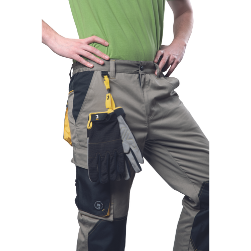 Szyte rękawice Hi-Vis wykonane z mieszanki poliestru i Spandexu wzmacniane syntetyczną skórą w części chwytnej i na koniuszkach palców. W części chwytnej dłoni silkonowy zadruk dla zwiększonej chwytności, neoprenowy mankiet zapinany na rzepy Velcro. Wstawka frotte chłonąca pot na wierzchniej części kciuka.