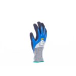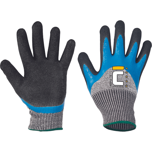 Szyte rękawice Hi-Vis z wodoodporną, oddychającą membraną, wykonane z poliestru z dodatkiem spandexu, w części chwytnej szybkoschnąca, synetyczna skóra z mikrofibry o grubości 0,8 mm, wposażone w piankę redukującą wibracje. W części chwytnej i na palcach zadrukowane wysokiej jakości silikonem. Opuszki palców pokryte syntetyczną skórą. Podszewka poliestrowa. Neoprenowy mankiet zapinany na rzep Velcro. Plastikowy haczyk z oznaczeniem rozmiaru. EN ISO 10819