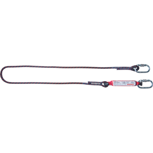 Amortyzator spadania z plecionego PA, z liną o długości 1,8 m, (średnica 10,5 mm), owalny zatrzaśnik na pochłaniaczu energii i na linie, spełnia wymogi normy EN 355 (CE 0082).