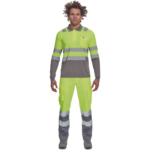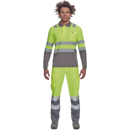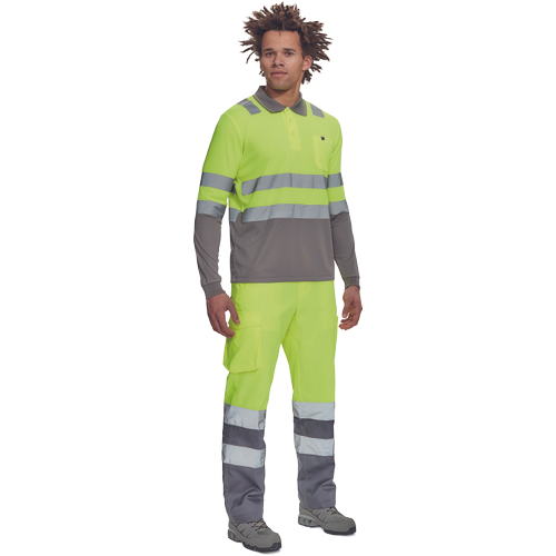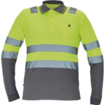 • Ostrzegawcza koszulka polo z odblaskowymi taśmami o szerokości 5 cm, długie rękawy, zapięcie na 3 guziki, elastyczne zakończenie rękawów, kołnierzyk w kontrastowym kolorze, kieszeń na piersi