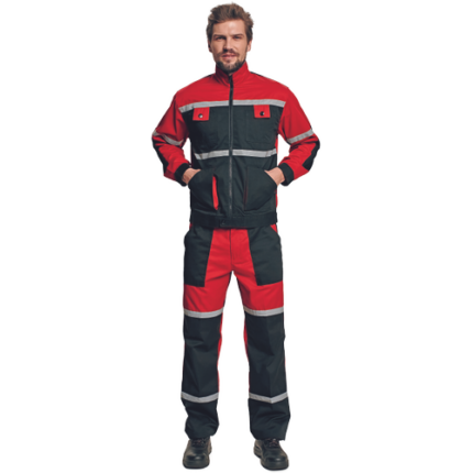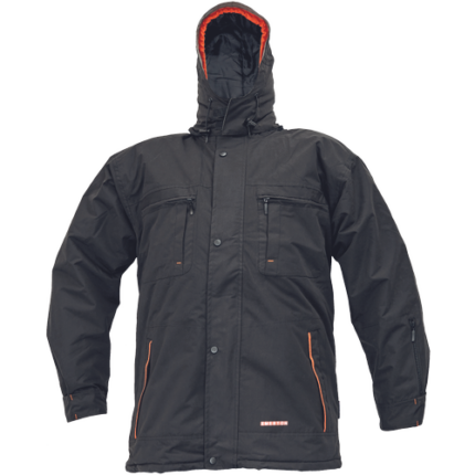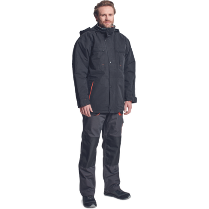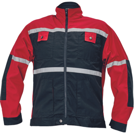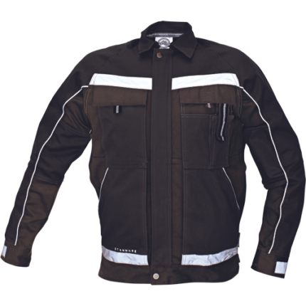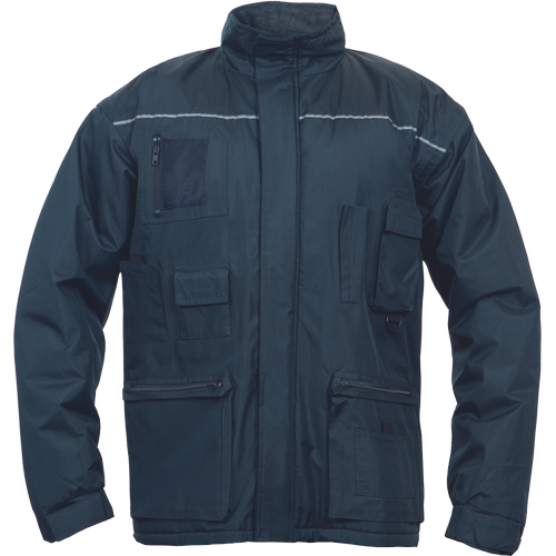 męska kurtka robocza ze stójką • powłoka wodo- oraz olejoodporna • zapięcie na zamek błyskawiczny oraz metalowe zatrzaski • wzmocnienia na rękawach, mankiety z zatrzaskami • 2 kieszenie piersiowe przykryte patkami zapinanymi na metalowe zatrzaski • pas regulujący z tyłu • elementy odblaskowe – taśmy szerokości 2,5 cm