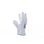 Szyte rękawice skórzane, typu driver. W części dłonicowej i na palcach (palec wskazujący w całości wykonany ze skóry). Grzbiet wykonany z dwoiny bydlęcej.