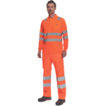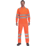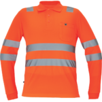 W pełni ostrzegawcza koszulka polo z odblaskowymi taśmami o szerokości 5 cm, długie rękawy, zapięcie na 3 guziki, elastyczne zakończenie rękawów, kołnierzyk wykonany z dzianiny, kieszeń na piersi