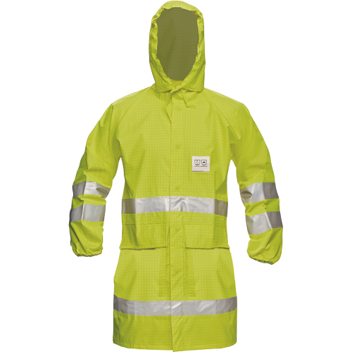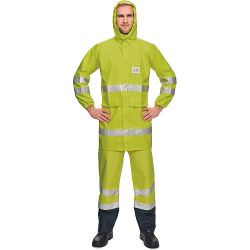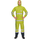 Kombinezon ochronny wysokiej widoczności z kołnierzem. Typ 5/6. C hroni przed działaniem cząstek stałych oraz orgranicznym zachlapaniem substancjami płynnymi. Odpowiednie do prac drogowych i kolejowych, prac przy utrzymaniu lotniska, prac z odpadami, w górnictwie, w rafineriach gazowych i naftowych, w ratownictwie itp. Szyte szwy. Elastyczne ściągacze przy mankietach, w talii i przy nogawkach.