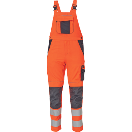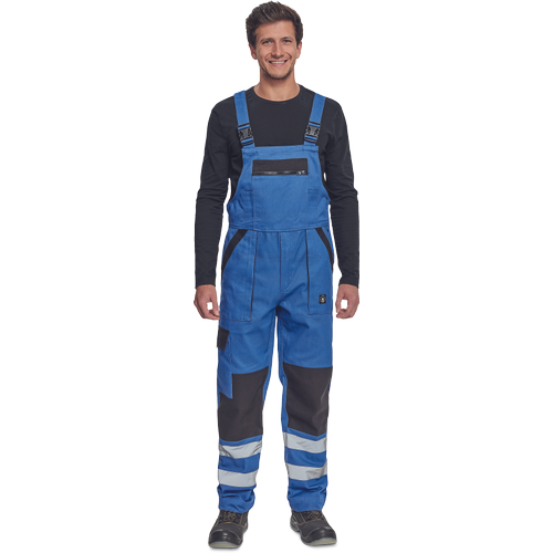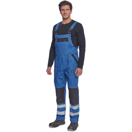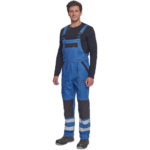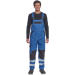 • męskie robocze spodnie ogrodniczki z elastycznym pasem • szerokie szelki z plastikowymi klamrami • 2 kieszenie boczne, 1 kieszeń na udzie, 1 duża kieszeń na piersi, 2 kieszenie tylne • kolana wzmocnione materiałem w kontrastowym kolorze • możliwość wydłużenia nogawek • odblaskowe taśmy wokół nogawek zwiększające widoczność