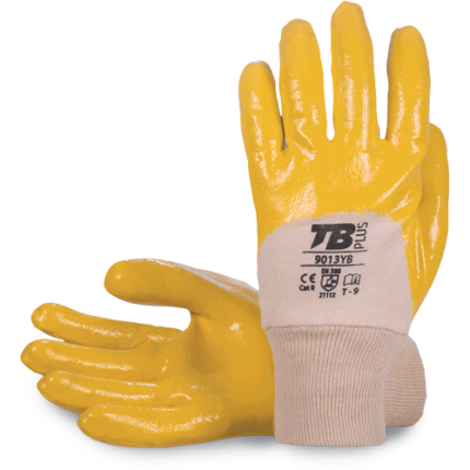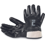 Sewn gloves from jersey liner, black nitrile dipped, with tough cuff. Dziane rękawice z bawełnianej tkaniny jersey, powlekane nitrylem w kolorze czarnym, z usztywnianym mankietem.