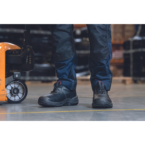 Półbuty ochronne z metalowym podnoskiem i antyprzebiciową wkładką. Podeszwa wykonana z PU podwójnej gęstości. Cholewka wykonana ze skóry.