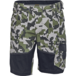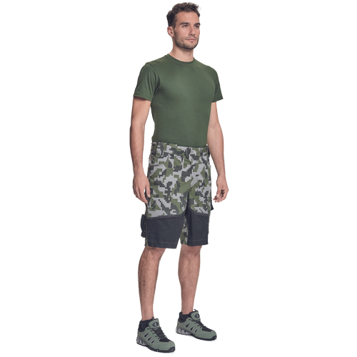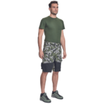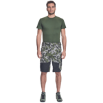 • męskie szorty robocze z elastycznego materiału Trifibetex® z nadrukiem moro • 2 przednie kieszenie klinowe, 2 tylne naszywane kieszenie zapinane na rzep, po lewej stronie duża kieszeń wielofunkcyjna, po prawej stronie wielofunkcyjne kieszenie na miarę i nóż + uchwyt na ołówek • metalowy pierścień „D”, paski na narzędzia, patent elastycznego pasa • ozdobne potrójne szwy w kontrastowym kolorze • odblaskowe detale ton w ton