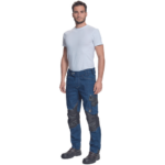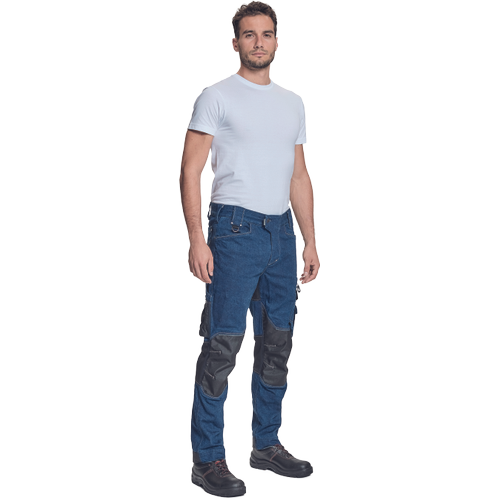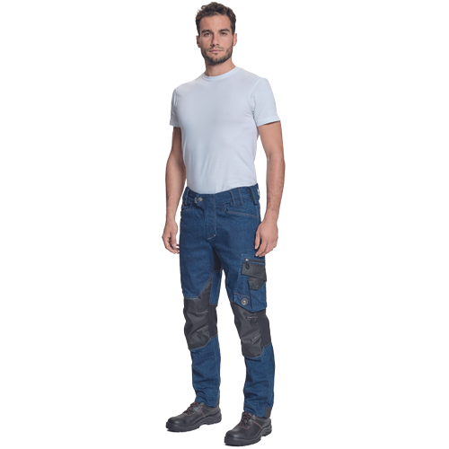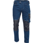 męskie spodnie robocze z elastycznego jeansu "pre-washed" połączonego z elementami unikalnego, trwałego materiału CORDURA®, TrifibetexPRO® i Trifibetex® w miejscach wymagających wzmocnienia, 2 przednie kieszenie klinowe, 2 tylne naszywane kieszenie zapinane na rzep, po lewej stronie duża kieszeń wielofunkcyjna, po prawej stronie wielofunkcyjne kieszenie na miarę i nóż + uchwyt na ołówek, metalowy pierścień „D”, wzmocnione nakolanniki z tkaniny CORDURA®, paski na narzędzia, patent elastycznego pasa, możliwość wydłużenia nogawek
