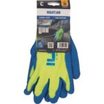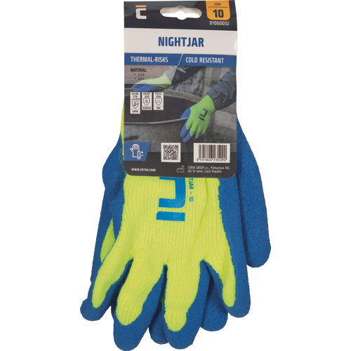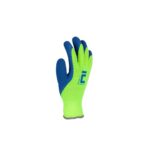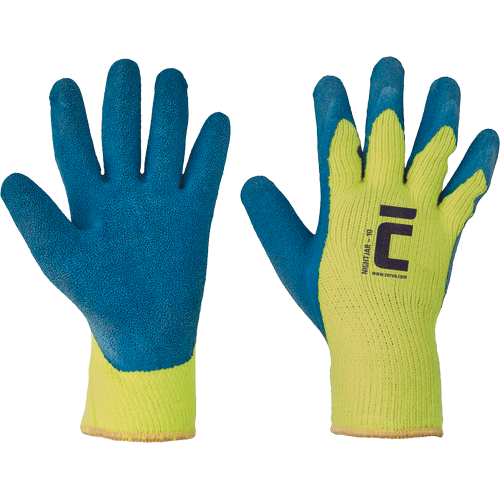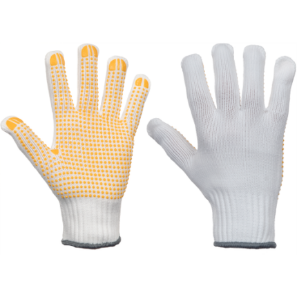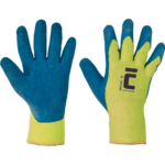 Dziane, bezszwowe, akrylowe rękawice, częściowo pokryte naturalnym lateksem, szorstkowane wykończenie.