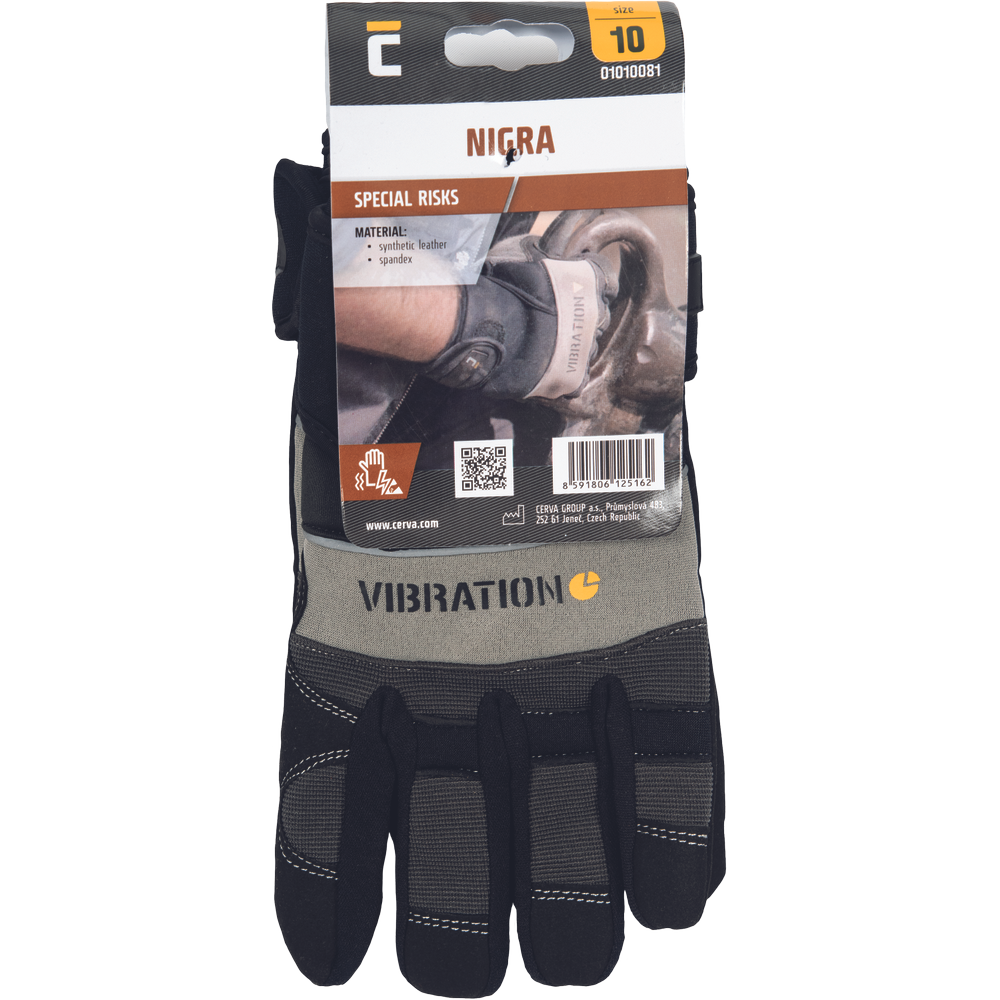 Rękawice ze sztucznego zamszu w części chwytnej, ze Spandexu na grzbiecie dłoni, włącznie z ochroną stawów ręki, z podwójnym ściąganym mankietem na rzepy i poduszkami antywibracyjnymi umieszczonymi w eksponowanych miejscach.