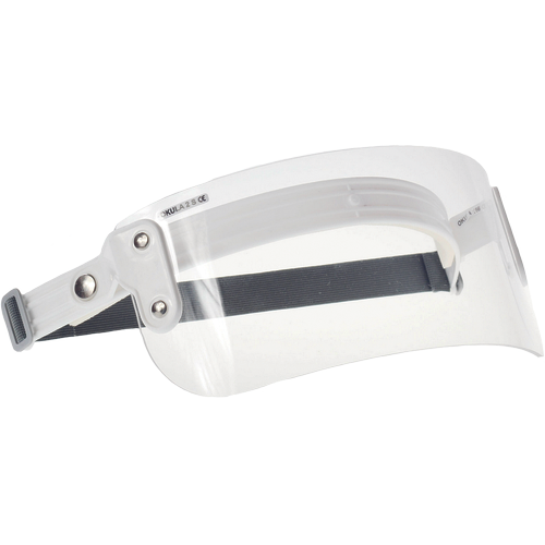 Protective shield without headband consisting of a frontal strip and a visor made of clear PMMA. The visor can be adjusted to the optimum working position. The shield is designed to protect the eyes and upper part of the face against the impact of large solid particles.