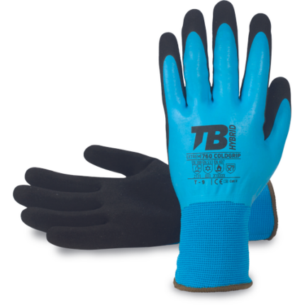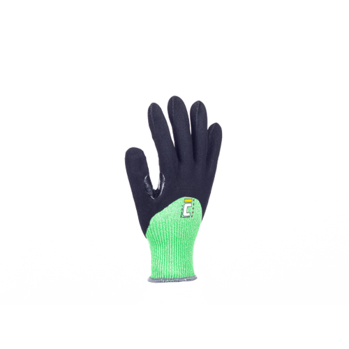 Szyte rękawice Hi-Vis z wodoodporną, oddychającą membraną, wykonane z poliestru z dodatkiem spandexu, w części chwytnej szybkoschnąca, synetyczna skóra z mikrofibry o grubości 0,8 mm, wposażone w piankę redukującą wibracje. W części chwytnej i na palcach zadrukowane wysokiej jakości silikonem. Opuszki palców pokryte syntetyczną skórą. Podszewka poliestrowa. Neoprenowy mankiet zapinany na rzep Velcro. Plastikowy haczyk z oznaczeniem rozmiaru. EN ISO 10819