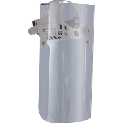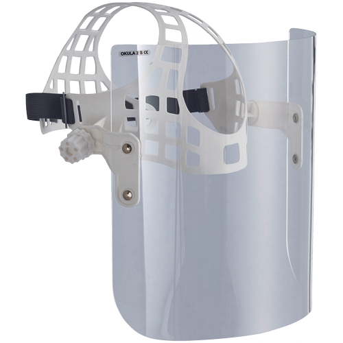 Osłona twarzy z nagłowiem, wymiary osłony: 220x290mm, wykonana z bezbarwnego PMMA o grubości 2mm. Przeznaczona do ochrony oczu i twarzy przed uderzeniami małych, wolno poruszających się cząsteczek stałych o energii uderzenia nie przekraczającej 0,56J. Umożliwia jednoczesne stosowanie okularów korekcyjnych. Zgodne z normą EN 166.