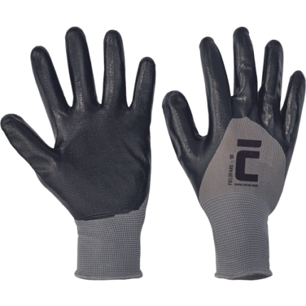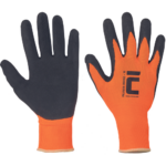 Rękawice ochronne z pięcioma palcami z przędzy syntetycznej, bezszwowe, pokryte warstwą lateksu w części chwytnej dłoni i na palcach.