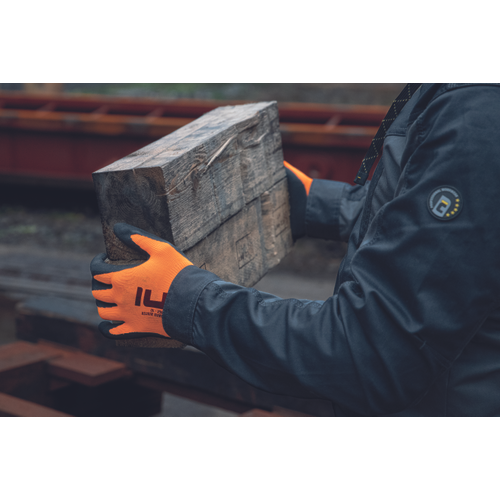 Szyte rękawice Hi-Vis z wodoodporną, oddychającą membraną, wykonane z poliestru z dodatkiem spandexu, w części chwytnej szybkoschnąca, synetyczna skóra z mikrofibry o grubości 0,8 mm, wposażone w piankę redukującą wibracje. W części chwytnej i na palcach zadrukowane wysokiej jakości silikonem. Opuszki palców pokryte syntetyczną skórą. Podszewka poliestrowa. Neoprenowy mankiet zapinany na rzep Velcro. Plastikowy haczyk z oznaczeniem rozmiaru. EN ISO 10819