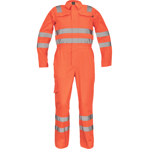 • męski roboczy kombinezon Hi-Vis z odblaskowymi taśmami • wokół ciała taśmy o szerokości 5 cm • wokół nóg taśmy o szerokości 7 cm • zamek zasłonięty plisą • 2 kieszenie boczne + 1 kieszeń na monety • 2 wielofunkcyjne kieszenie boczne na nogawkach • 2 tylne kieszenie • 1 duża kieszeń z patką na piersi • elastyczne wstawki w talii • możliwość wydłużenia nogawek