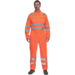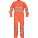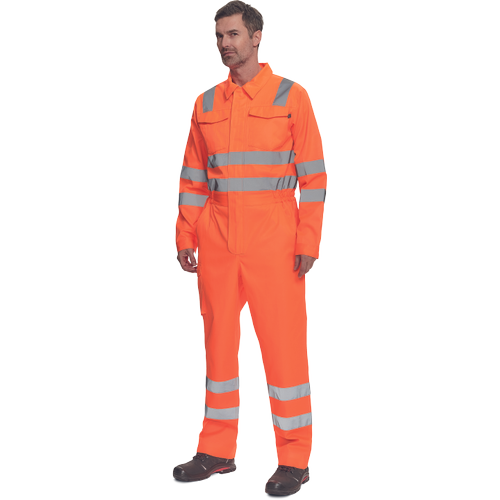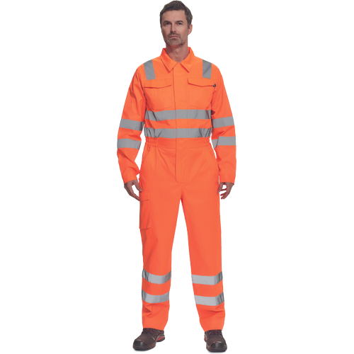 • męski roboczy kombinezon Hi-Vis z odblaskowymi taśmami • wokół ciała taśmy o szerokości 5 cm • wokół nóg taśmy o szerokości 7 cm • zamek zasłonięty plisą • 2 kieszenie boczne + 1 kieszeń na monety • 2 wielofunkcyjne kieszenie boczne na nogawkach • 2 tylne kieszenie • 1 duża kieszeń z patką na piersi • elastyczne wstawki w talii • możliwość wydłużenia nogawek