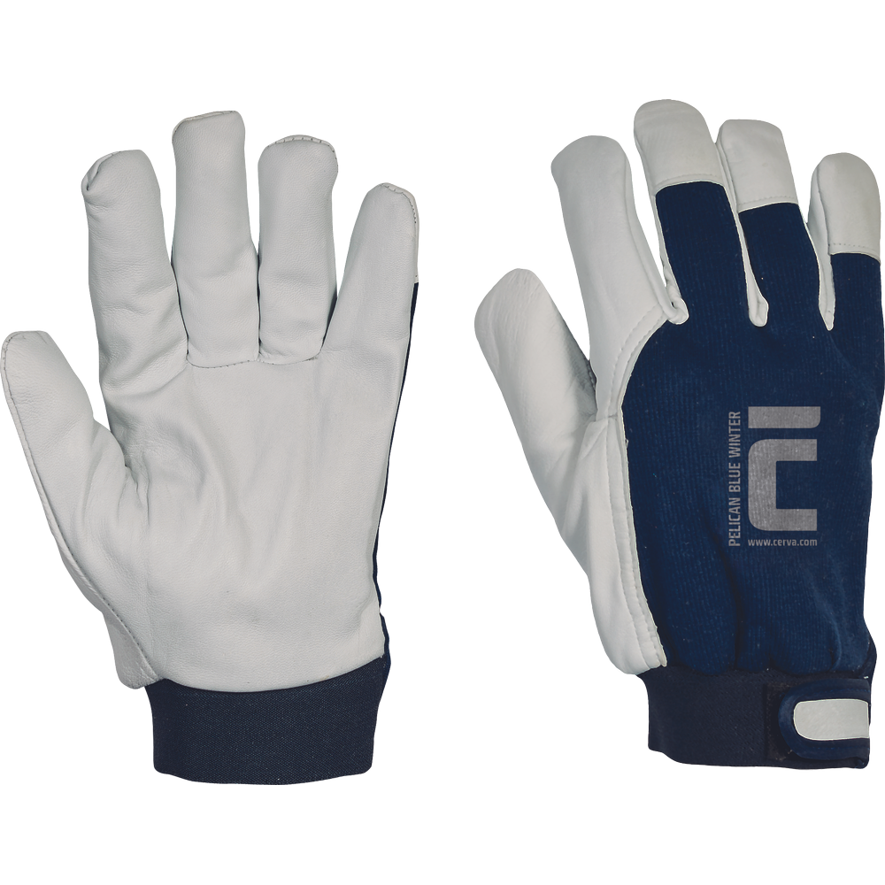 Ocieplane rękawice wzmacniane delikatną skórą kozią licową, grzbiet dłoni wykonany z granatowej tkaniny bawełnianej, mankiet zapinany na rzep.