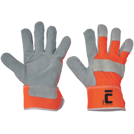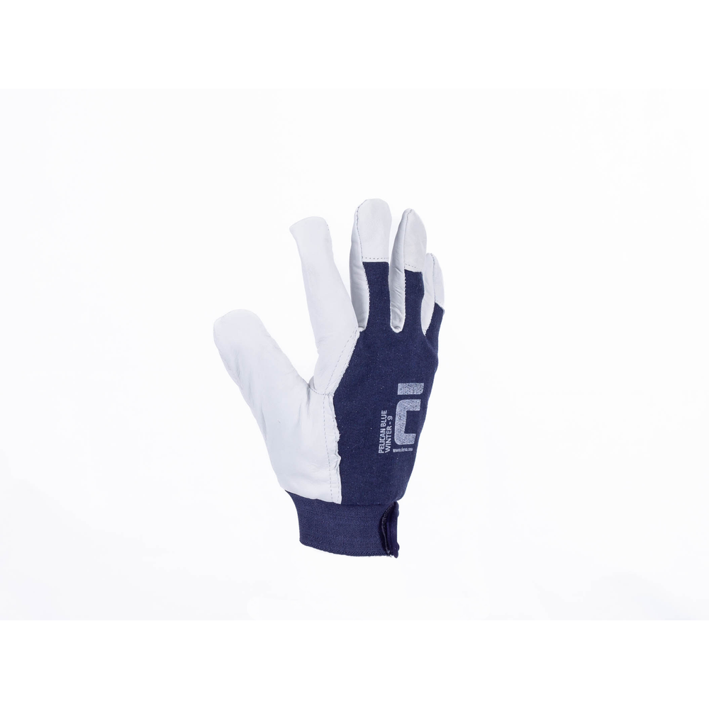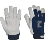 Ocieplane rękawice wzmacniane delikatną skórą kozią licową, grzbiet dłoni wykonany z granatowej tkaniny bawełnianej, mankiet zapinany na rzep.