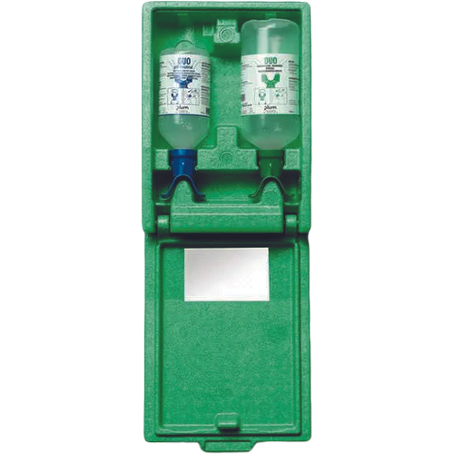 wall-mounted eyewash boxes made of maintenance-free material for easy and quick first aid for eye injuries; regardless of the circumstances, a quick response is usually required when the eye is hit; therefore, you need to be well prepared in the workplace with the right first aid supplies; the Plum line includes a variety of eyewash stations; Plum Combi-Box DUO Maxi contains 500 ml eyewash pH Neutral 4.9% and 1000 ml eyewash 0.9% sodium chloride solution