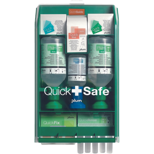 wall cabinet made of impact-resistant plastic with a transparent case, contains: 2 x 500 ml eyewash bottles with sterile 0.9% sodium chloride solution, 1 x 200ml eyewash bottle pH Neutral 4.9% phosphate, 20 pcs cleaning agent for QuickClean wounds, 18 x QuickCool burn gel, 1 set of QuickStop wound dressings, 5 x QuickRinse eyewash ampoules, 1 x elastic QuickFix Patch Refill, instructions for use; dimensions 465 x 265 x 130 mm; use for eye washes, wound care, minor injuries and burns; packaging: 1 piece