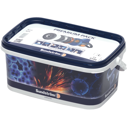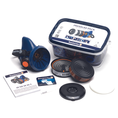 Zestaw Premium to półmaska SR 100/filtr cząstek stałych SR 510 P3 R/filtr przeciwgazowy SR 217 A1/filtr wstępny/oprawa filtra wstępnego/chusteczka czyszcząca.