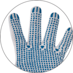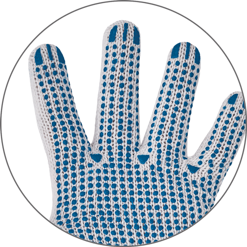 Dziane, bezszwowe, obustronne rękawice z mieszanki poliester /bawełna, nakrapiane PVC, elastyczny ściągacz.