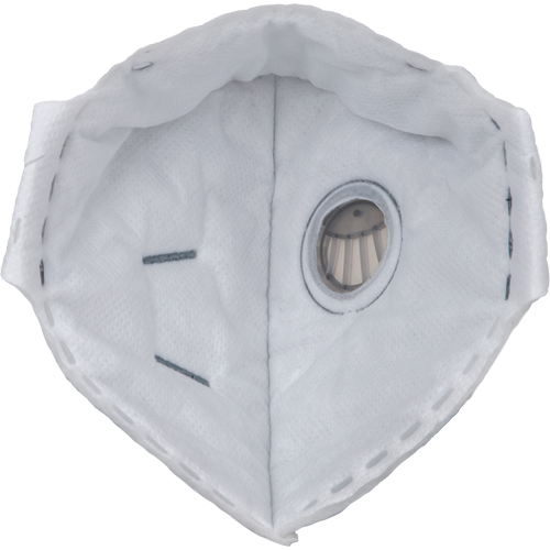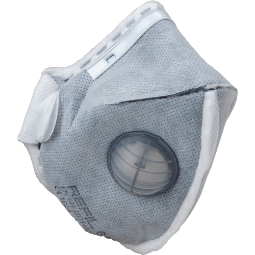 Składany respirator z zaworem wydechowym i warstwą węgla aktywnego do 12x NPK/PEL, chroni przed cząstkami stałymi i ciekłymi aerozolami, przed parami, gazami i ozonem, poniżej NPK, FFP2 NR.