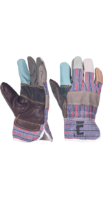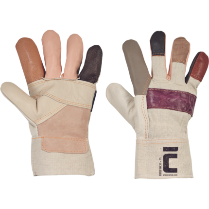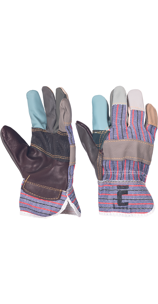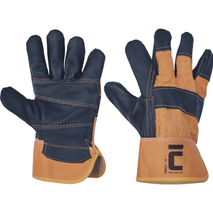 Rękawice wzmacniane licową skórą meblową, z podszewką w części chwytnej dłoni, grzbiet dłoni oraz mankiet wykonane z tkaniny bawełnianej.