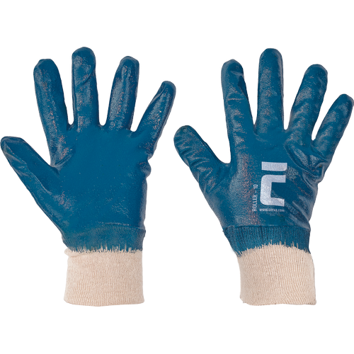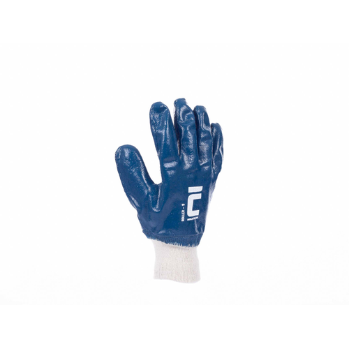 Granatowe rękawice szyte z bawełnianej dzianiny, w całości pokryte nitrylem, elastyczny ściągacz.