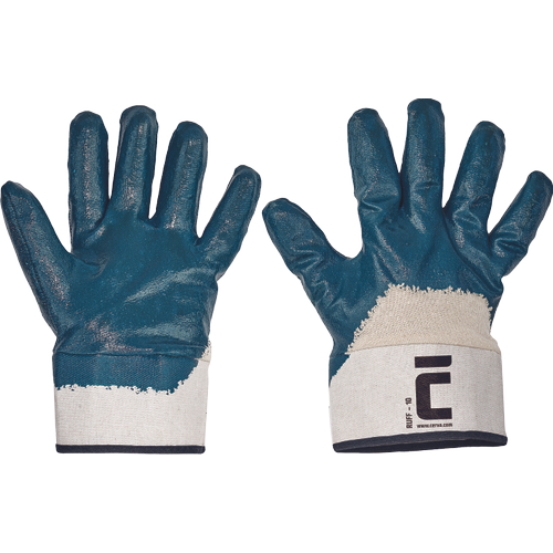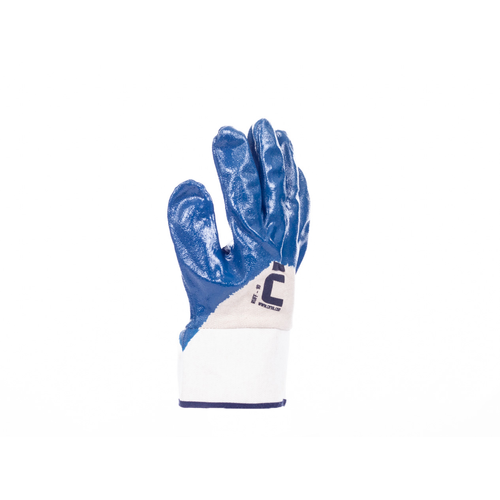 Granatowe rękawice szyte z bawełnianej dzianiny, w całości pokryte nitrylem, sztywny mankiet.