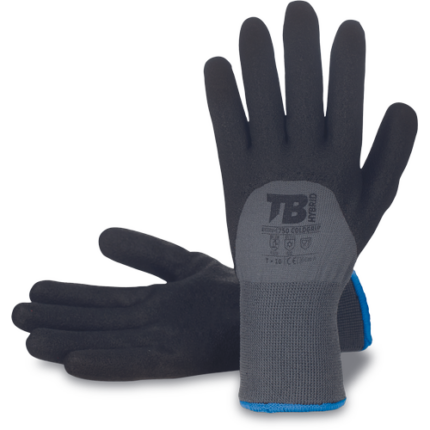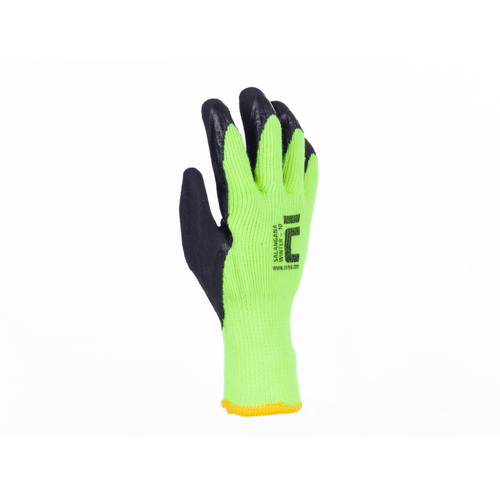 Ocieplane, bezszwowe rękawice ochronne dziane z przędzy syntetycznej, z mikroporowatą i oddychającą warstwą lateksu w części dłonicowej i na palcach; elastyczny mankiet w nadgarstkach.