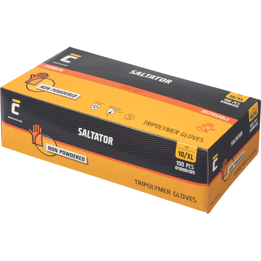 • non-sterile disposable gloves made of Trilite (latex, nitrile and neoprene) with full texture, 100 pcs per dispenser box • provides maximum sensitivity, dexterity and comfort • micro-textured palm and fingers for excellent grip • rolled cuff for additional strength and to prevent liquid roll back • powder free, reducing the risk of product contamination